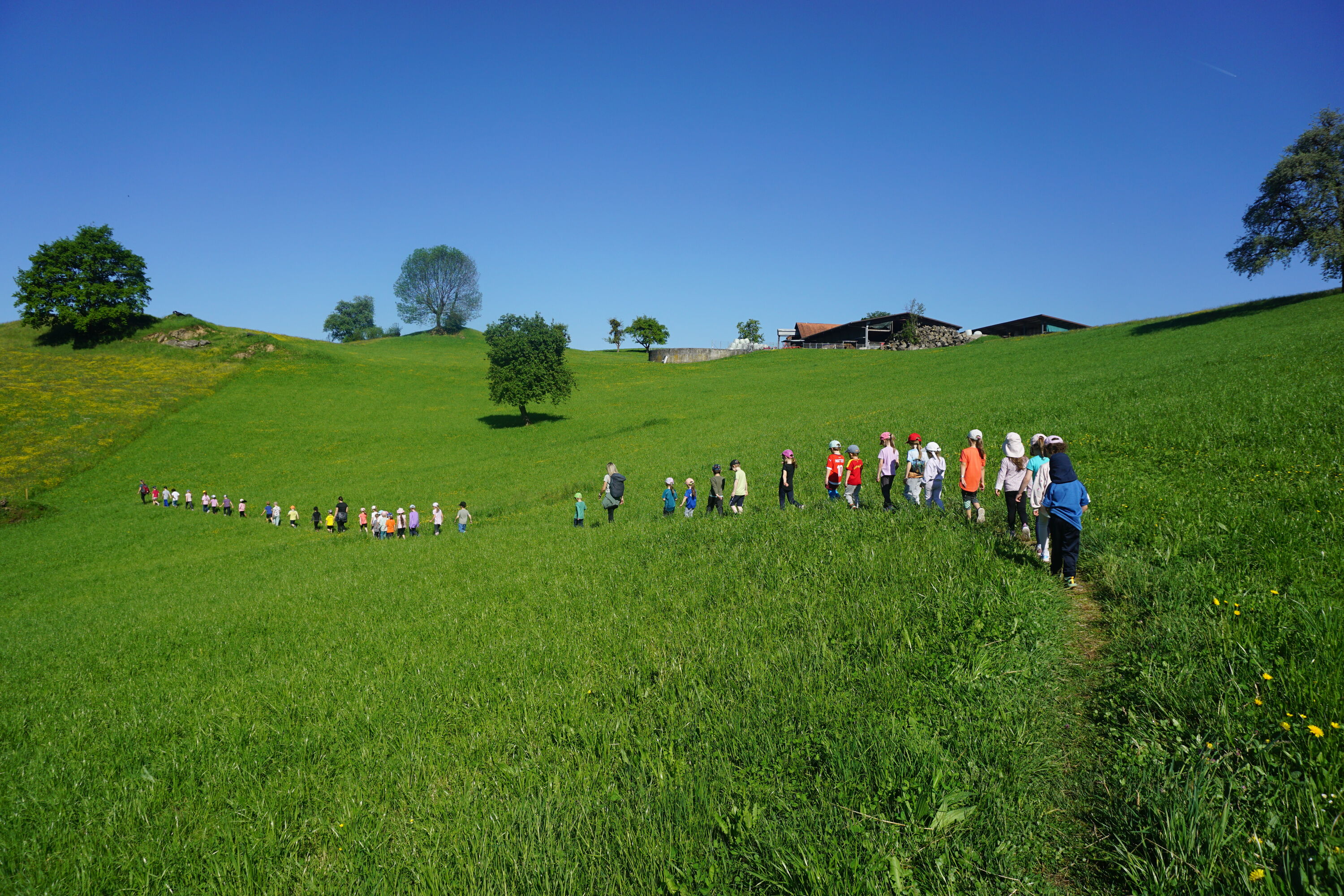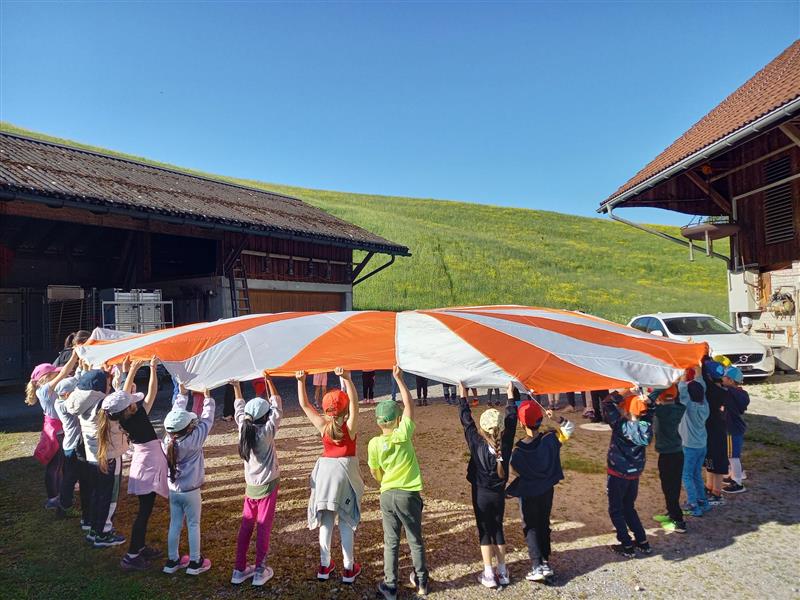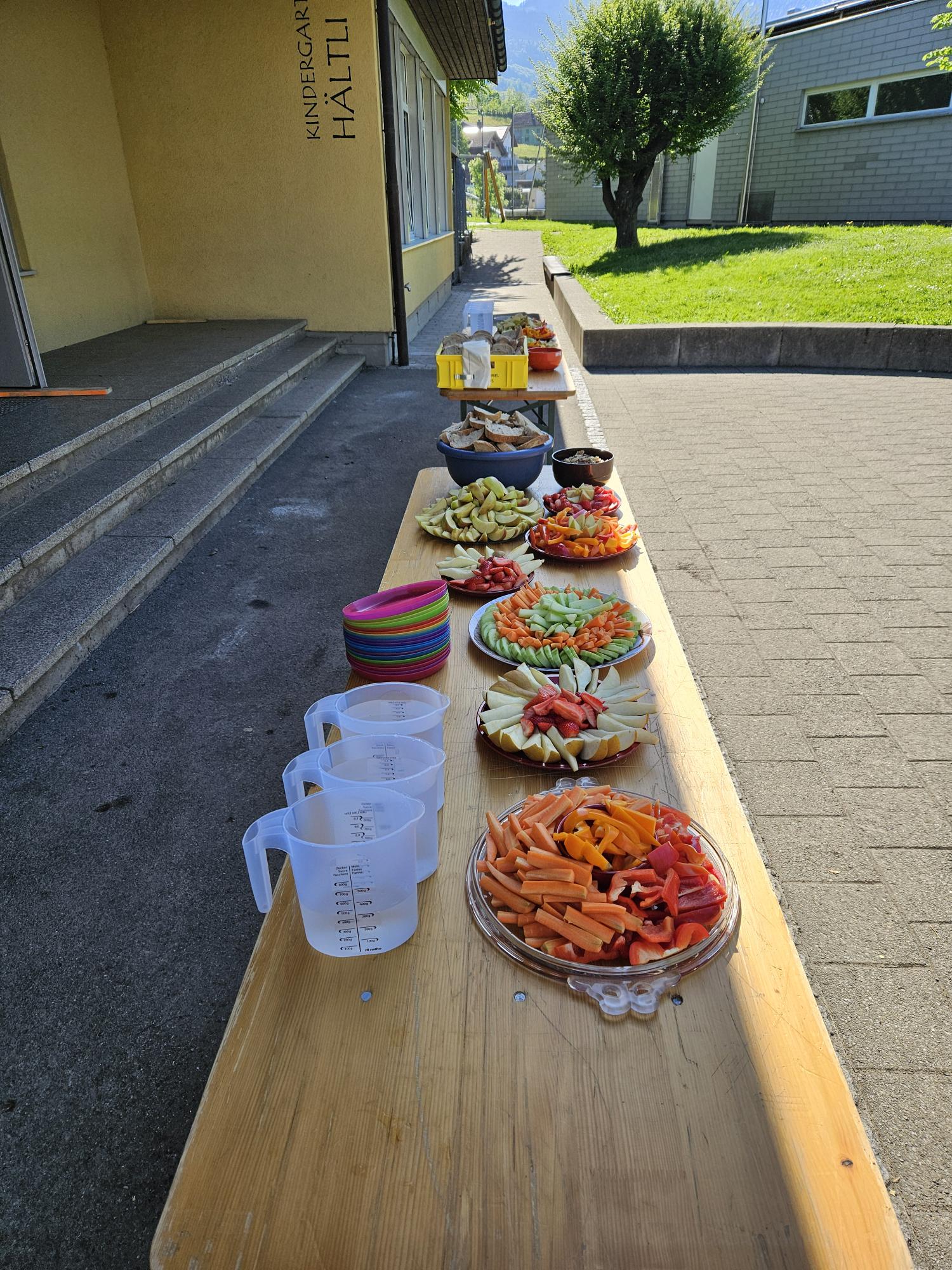 Am Dienstagmorgen fand bei strahlendem Sonnenschein der Kindergarten-Sporttag statt. Immer zwei Kindergartenklassen machten sich mit viel Vorfreude gemeinsam auf den Weg rund um den Hältlihügel. An verschiedenen Posten durften die Kinder zum Fliegerlied oder Laurentia ausgelassen tanzen, wie Tiere hüpfen, anschleichen, fliegen, stampfen..., mit einem riesengrossen Fallschirmtuch "fliegen lernen" und mit Ballonen spielen. Müde aber zufrieden trafen sich alle Kinder beim Kindergarten Hältli, wo fleissige Eltern einen reichhaltigen Znüni vorbereitet hatten. Danke nochmals!